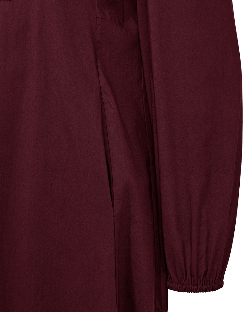 Ribbestrikket kjole med høy hals og puffermer med bred mansjett.
