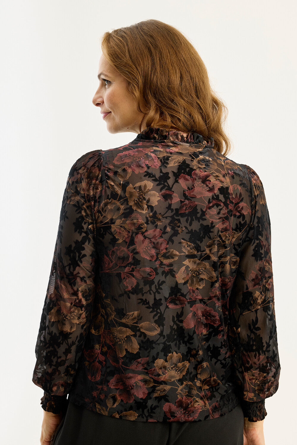 Lekker topp med mønster i velour, rysjekant og knapp i halsen og bred strikk i erme