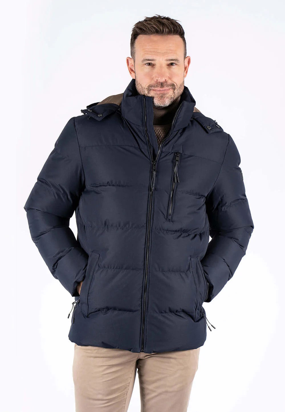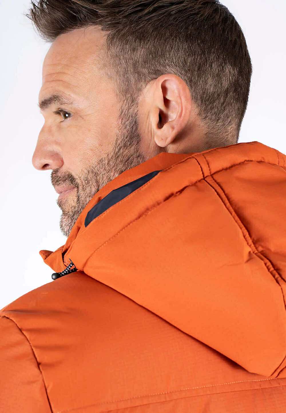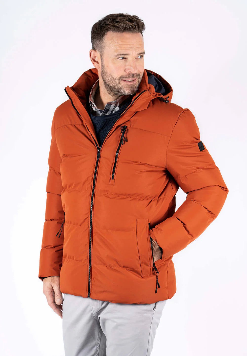 Sporty pufferjakke med hette og detaljer. Glidelås og 3 lommer.