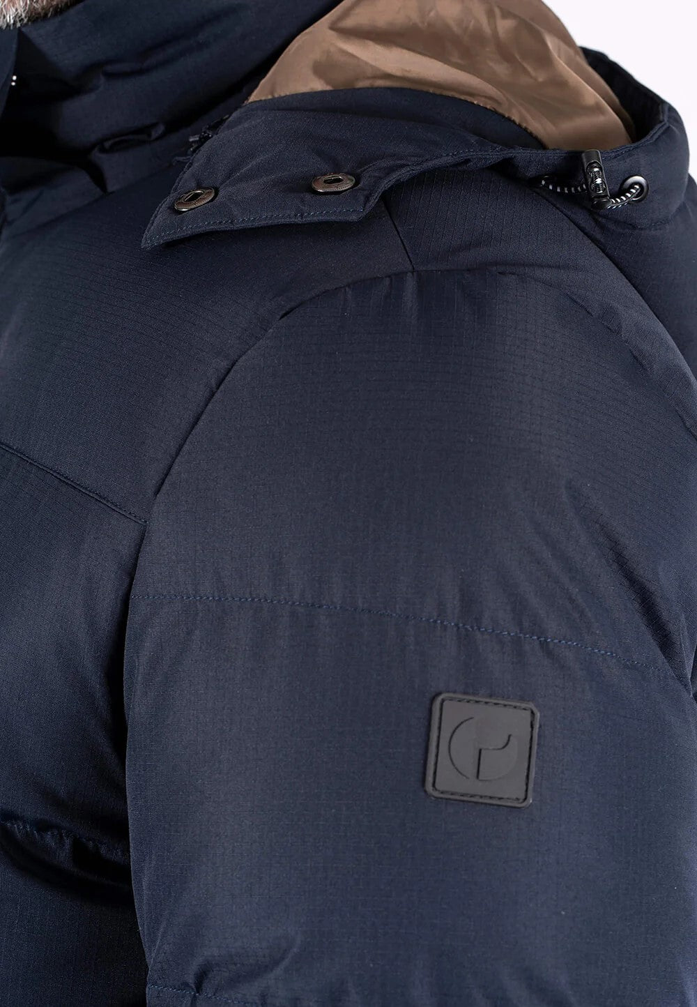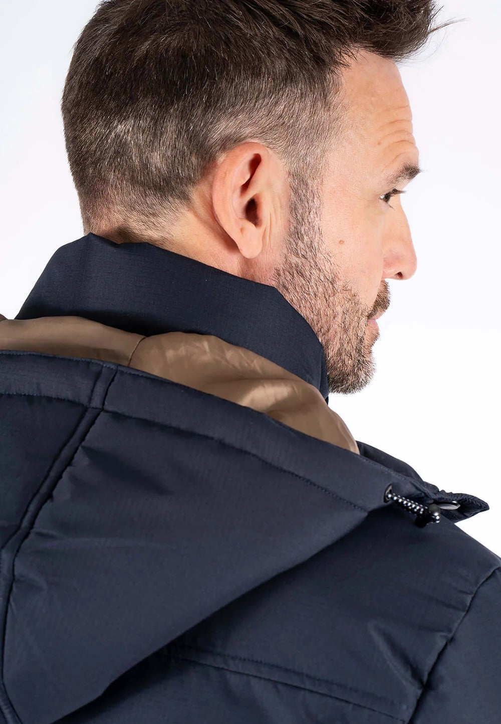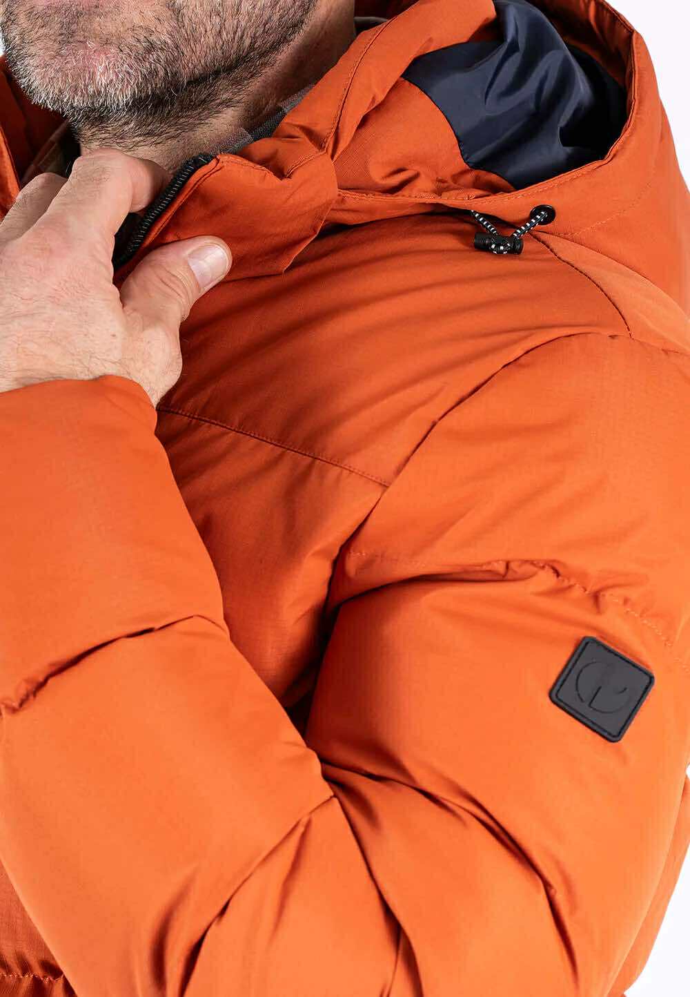 Sporty pufferjakke med hette og detaljer. Glidelås og 3 lommer.