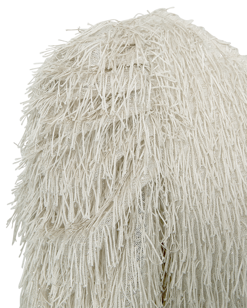 Lekker pyntetopp med glitter, frynser og en liten puff på erme fra Freequent
